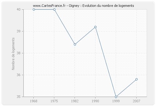 Le nombre de logements d'Oigney était de 36 en 2007, 35 en 1999, 39 en 1990, 38 en 1982, 40 en 1975 et 40 en 1968.