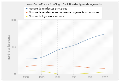- Nombre de résidences principales d'Oingt en 2007 : 223