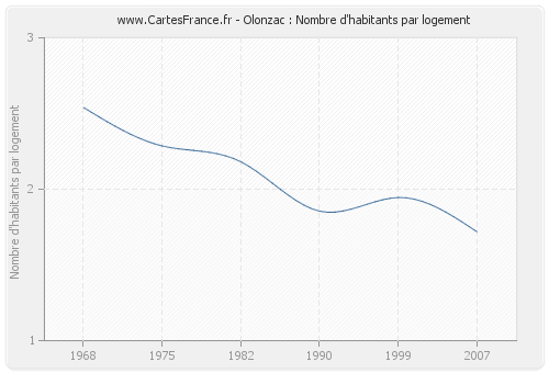 - Nombre d'habitants moyen par logement d'Olonzac en 2007 : 1,72