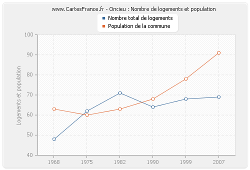 La population d'Oncieu était de 91 habitants en 2007, 78 habitants en 1999, 68 habitants en 1990, 63 habitants en 1982, 60 habitants en 1975 et 63 habitants en 1968. Parallèlement, le nombre de logements d'Oncieu était de 69 en 2007, 68 en 1999, 64 en 1990, 71 en 1982, 62 en 1975 et 48 en 1968.
