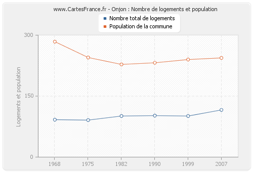 La population d'Onjon était de 244 habitants en 2007, 240 habitants en 1999, 232 habitants en 1990, 228 habitants en 1982, 245 habitants en 1975 et 284 habitants en 1968. Parallèlement, le nombre de logements d'Onjon était de 116 en 2007, 101 en 1999, 102 en 1990, 101 en 1982, 91 en 1975 et 92 en 1968.