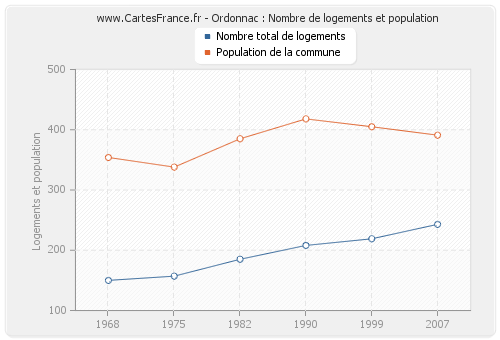 La population d'Ordonnac était de 391 habitants en 2007, 405 habitants en 1999, 418 habitants en 1990, 385 habitants en 1982, 338 habitants en 1975 et 354 habitants en 1968. Parallèlement, le nombre de logements d'Ordonnac était de 243 en 2007, 219 en 1999, 208 en 1990, 185 en 1982, 157 en 1975 et 150 en 1968.