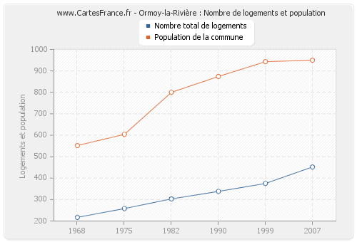 La population d'Ormoy-la-Rivière était de 950 habitants en 2007, 943 habitants en 1999, 874 habitants en 1990, 800 habitants en 1982, 604 habitants en 1975 et 552 habitants en 1968. Parallèlement, le nombre de logements d'Ormoy-la-Rivière était de 452 en 2007, 375 en 1999, 338 en 1990, 303 en 1982, 258 en 1975 et 217 en 1968.