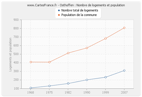 La population d'Osthoffen était de 807 habitants en 2007, 683 habitants en 1999, 573 habitants en 1990, 514 habitants en 1982, 408 habitants en 1975 et 409 habitants en 1968. Parallèlement, le nombre de logements d'Osthoffen était de 310 en 2007, 232 en 1999, 202 en 1990, 159 en 1982, 131 en 1975 et 108 en 1968.