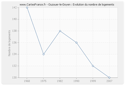 Le nombre de logements d'Ouzouer-le-Doyen était de 130 en 2007, 132 en 1999, 136 en 1990, 138 en 1982, 134 en 1975 et 142 en 1968.