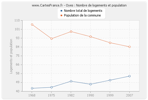 La population d'Oyes était de 84 habitants en 2007, 88 habitants en 1999, 94 habitants en 1990, 99 habitants en 1982, 92 habitants en 1975 et 106 habitants en 1968. Parallèlement, le nombre de logements d'Oyes était de 55 en 2007, 51 en 1999, 47 en 1990, 50 en 1982, 44 en 1975 et 43 en 1968.