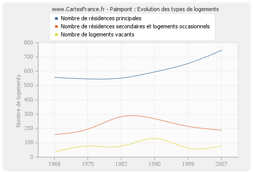 Les graphiques suivant reprennent l'historique du nombre et du type de logements de Paimpont de 1968 à 2007. Le deuxième graphique est tracé en interpolation cubique. Ceci permet d'obtenir plus précisément le nombre de logement du village de Paimpont les années ou aucun recensement n'a été effectué.