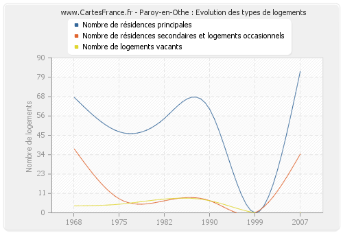 Les graphiques suivant reprennent l'historique du nombre et du type de logements de Paroy-en-Othe de 1968 à 2007. Le deuxième graphique est tracé en interpolation cubique. Ceci permet d'obtenir plus précisément le nombre de logement du village de Paroy-en-Othe les années ou aucun recensement n'a été effectué.