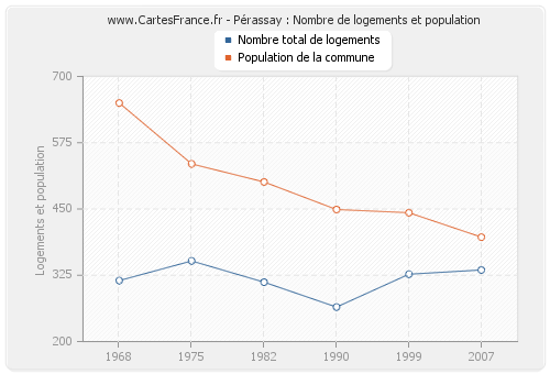 La population de Pérassay était de 397 habitants en 2007, 443 habitants en 1999, 449 habitants en 1990, 501 habitants en 1982, 535 habitants en 1975 et 650 habitants en 1968. Parallèlement, le nombre de logements de Pérassay était de 335 en 2007, 327 en 1999, 265 en 1990, 312 en 1982, 352 en 1975 et 315 en 1968.