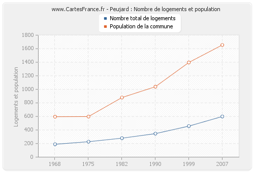 La population de Peujard était de 1 655 habitants en 2007, 1 397 habitants en 1999, 1 039 habitants en 1990, 879 habitants en 1982, 598 habitants en 1975 et 596 habitants en 1968. Parallèlement, le nombre de logements de Peujard était de 599 en 2007, 457 en 1999, 346 en 1990, 279 en 1982, 227 en 1975 et 189 en 1968.
