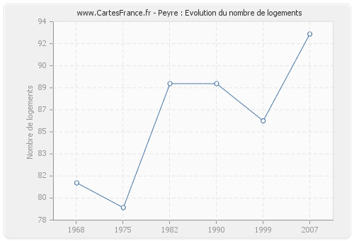 Le nombre de logements de Peyre était de 93 en 2007, 86 en 1999, 89 en 1990, 89 en 1982, 79 en 1975 et 81 en 1968.