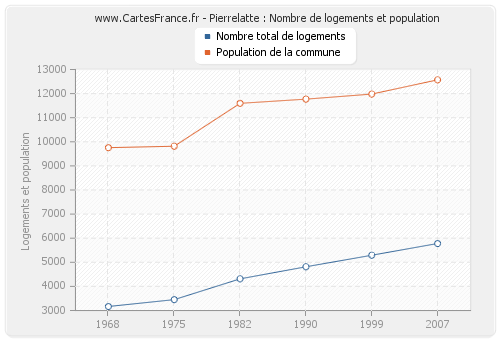 La population de Pierrelatte était de 12 571 habitants en 2007, 11 980 habitants en 1999, 11 770 habitants en 1990, 11 596 habitants en 1982, 9 816 habitants en 1975 et 9 757 habitants en 1968. Parallèlement, le nombre de logements de Pierrelatte était de 5 780 en 2007, 5 293 en 1999, 4 814 en 1990, 4 313 en 1982, 3 451 en 1975 et 3 166 en 1968.