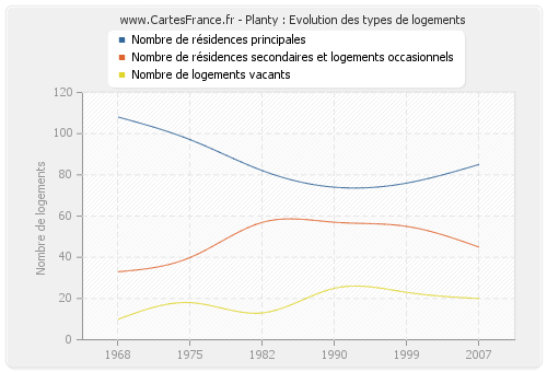 En 2007 les logements de Planty étaient composés de 85 résidences principales, 45 résidences secondaires ou occasionnels ainsi que 20 logements vacants.