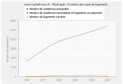 Les graphiques suivant reprennent l'historique du nombre et du type de logements de Ploufragan de 1968 à 2007. Le deuxième graphique est tracé en interpolation cubique. Ceci permet d'obtenir plus précisément le nombre de logement de la ville de Ploufragan les années ou aucun recensement n'a été effectué.