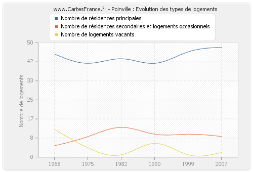 En 2007 les logements de Poinville étaient composés de 48 résidences principales, 9 résidences secondaires ou occasionnels ainsi que 2 logements vacants.