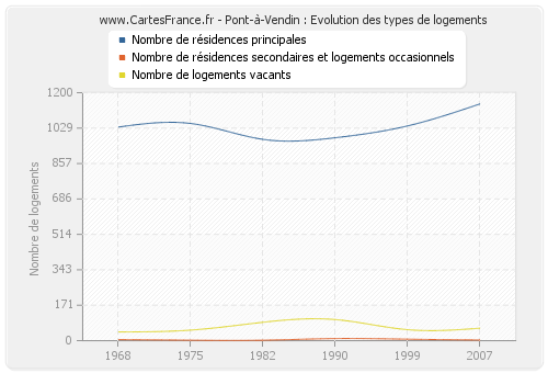 Les graphiques suivant reprennent l'historique du nombre et du type de logements de Pont-à-Vendin de 1968 à 2007. Le deuxième graphique est tracé en interpolation cubique. Ceci permet d'obtenir plus précisément le nombre de logement de la ville de Pont-à-Vendin les années ou aucun recensement n'a été effectué.