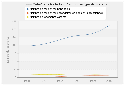 Les graphiques suivant reprennent l'historique du nombre et du type de logements de Pontacq de 1968 à 2007. Le deuxième graphique est tracé en interpolation cubique. Ceci permet d'obtenir plus précisément le nombre de logement de la ville de Pontacq les années ou aucun recensement n'a été effectué.