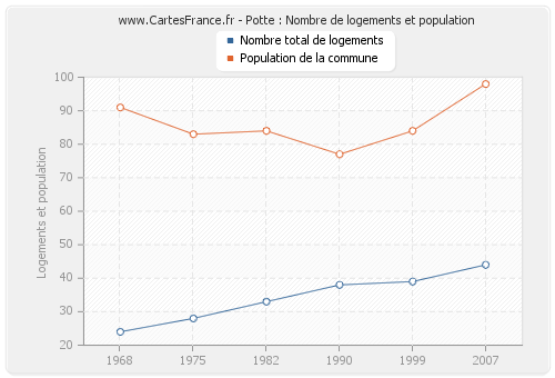 La population de Potte était de 98 habitants en 2007, 84 habitants en 1999, 77 habitants en 1990, 84 habitants en 1982, 83 habitants en 1975 et 91 habitants en 1968. Parallèlement, le nombre de logements de Potte était de 44 en 2007, 39 en 1999, 38 en 1990, 33 en 1982, 28 en 1975 et 24 en 1968.