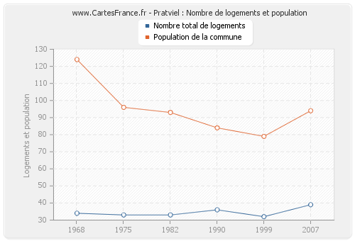 La population de Pratviel était de 94 habitants en 2007, 79 habitants en 1999, 84 habitants en 1990, 93 habitants en 1982, 96 habitants en 1975 et 124 habitants en 1968. Parallèlement, le nombre de logements de Pratviel était de 39 en 2007, 32 en 1999, 36 en 1990, 33 en 1982, 33 en 1975 et 34 en 1968.