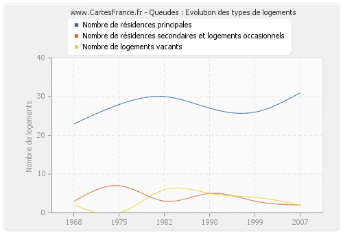 Les graphiques suivant reprennent l'historique du nombre et du type de logements de Queudes de 1968 à 2007. Le deuxième graphique est tracé en interpolation cubique. Ceci permet d'obtenir plus précisément le nombre de logement du village de Queudes les années ou aucun recensement n'a été effectué.