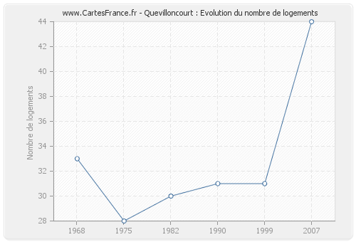 Le nombre de logements de Quevilloncourt était de 44 en 2007, 31 en 1999, 31 en 1990, 30 en 1982, 28 en 1975 et 33 en 1968.