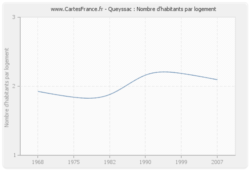 - Nombre d'habitants moyen par logement de Queyssac en 2007 : 2,10