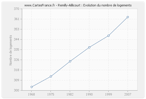 Les graphiques suivant reprennent l'historique du nombre et du type de logements de Remilly-Aillicourt de 1968 à 2007. Le deuxième graphique est tracé en interpolation cubique. Ceci permet d'obtenir plus précisément le nombre de logement du village de Remilly-Aillicourt les années ou aucun recensement n'a été effectué.