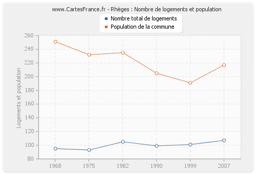 La population de Rhèges était de 217 habitants en 2007, 191 habitants en 1999, 205 habitants en 1990, 235 habitants en 1982, 232 habitants en 1975 et 251 habitants en 1968. Parallèlement, le nombre de logements de Rhèges était de 107 en 2007, 101 en 1999, 99 en 1990, 105 en 1982, 93 en 1975 et 95 en 1968.