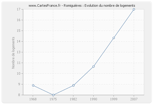 Historique du nombre de logements de Romiguières de 1968 à 2007 :