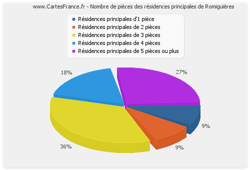 Le Village de Romiguières recensait la même année un total de 11 ménages. Les graphiques suivants présentent les statistiques d'habitation de ces ménages de Romiguières.