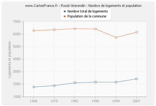 La population de Roost-Warendin était de 6 157 habitants en 2007, 5 746 habitants en 1999, 6 413 habitants en 1990, 6 439 habitants en 1982, 6 356 habitants en 1975 et 6 292 habitants en 1968. Parallèlement, le nombre de logements de Roost-Warendin était de 2 431 en 2007, 2 169 en 1999, 2 170 en 1990, 2 119 en 1982, 1 894 en 1975 et 1 784 en 1968.