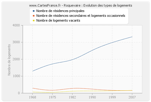 Les graphiques suivant reprennent l'historique du nombre et du type de logements de Roquevaire de 1968 à 2007. Le deuxième graphique est tracé en interpolation cubique. Ceci permet d'obtenir plus précisément le nombre de logement de la ville de Roquevaire les années ou aucun recensement n'a été effectué.