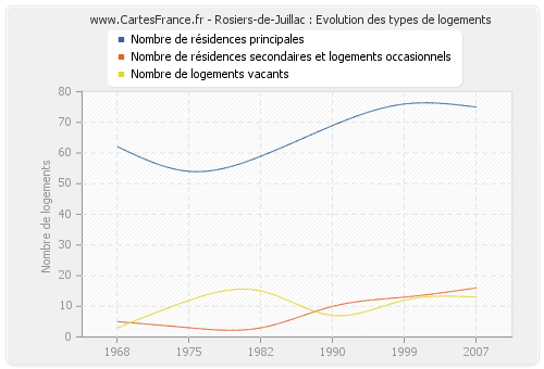 Les graphiques suivant reprennent l'historique du nombre et du type de logements de Rosiers-de-Juillac de 1968 à 2007. Le deuxième graphique est tracé en interpolation cubique. Ceci permet d'obtenir plus précisément le nombre de logement du village de Rosiers-de-Juillac les années ou aucun recensement n'a été effectué.
