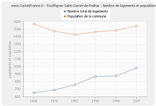 La population de Rouffignac-Saint-Cernin-de-Reilhac était de 1 542 habitants en 2007, 1 484 habitants en 1999, 1 465 habitants en 1990, 1 429 habitants en 1982, 1 474 habitants en 1975 et 1 571 habitants en 1968. Parallèlement, le nombre de logements de Rouffignac-Saint-Cernin-de-Reilhac était de 984 en 2007, 878 en 1999, 871 en 1990, 760 en 1982, 691 en 1975 et 653 en 1968.
