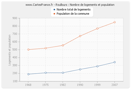Historique du nombre de logements de Roullours de 1968 à 2007 :