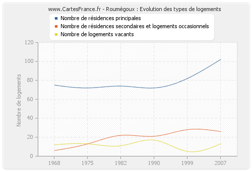 - Nombre de résidences principales de Roumégoux en 2007 : 102