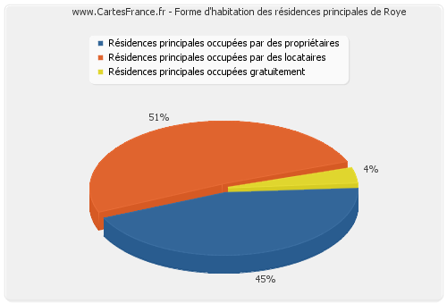 En 2007, 1 136 résidences principales de Roye étaient occupées par des propriétaires.