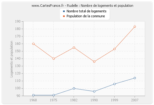 La population de Rudelle était de 183 habitants en 2007, 153 habitants en 1999, 136 habitants en 1990, 155 habitants en 1982, 140 habitants en 1975 et 160 habitants en 1968. Parallèlement, le nombre de logements de Rudelle était de 114 en 2007, 106 en 1999, 96 en 1990, 100 en 1982, 91 en 1975 et 91 en 1968.