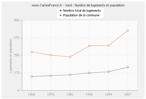 La population de Sacé était de 427 habitants en 2007, 320 habitants en 1999, 318 habitants en 1990, 239 habitants en 1982, 251 habitants en 1975 et 274 habitants en 1968. Parallèlement, le nombre de logements de Sacé était de 165 en 2007, 133 en 1999, 125 en 1990, 111 en 1982, 105 en 1975 et 99 en 1968.