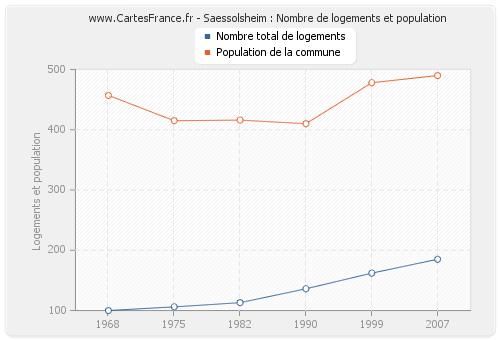 La population de Saessolsheim était de 490 habitants en 2007, 478 habitants en 1999, 410 habitants en 1990, 416 habitants en 1982, 415 habitants en 1975 et 457 habitants en 1968. Parallèlement, le nombre de logements de Saessolsheim était de 185 en 2007, 162 en 1999, 136 en 1990, 113 en 1982, 106 en 1975 et 100 en 1968.
