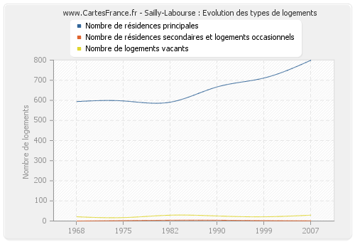 Les graphiques suivant reprennent l'historique du nombre et du type de logements de Sailly-Labourse de 1968 à 2007. Le deuxième graphique est tracé en interpolation cubique. Ceci permet d'obtenir plus précisément le nombre de logement de la ville de Sailly-Labourse les années ou aucun recensement n'a été effectué.