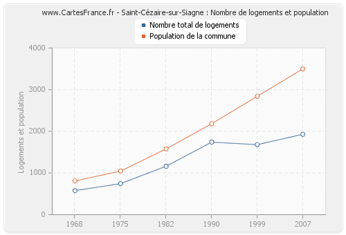 La population de Saint-Cézaire-sur-Siagne était de 3 499 habitants en 2007, 2 841 habitants en 1999, 2 182 habitants en 1990, 1 578 habitants en 1982, 1 046 habitants en 1975 et 809 habitants en 1968. Parallèlement, le nombre de logements de Saint-Cézaire-sur-Siagne était de 1 929 en 2007, 1 680 en 1999, 1 740 en 1990, 1 161 en 1982, 744 en 1975 et 577 en 1968.