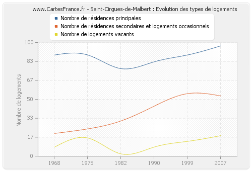 Les graphiques suivant reprennent l'historique du nombre et du type de logements de Saint-Cirgues-de-Malbert de 1968 à 2007. Le deuxième graphique est tracé en interpolation cubique. Ceci permet d'obtenir plus précisément le nombre de logement du village de Saint-Cirgues-de-Malbert les années ou aucun recensement n'a été effectué.