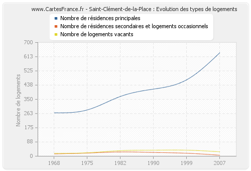 Les graphiques suivant reprennent l'historique du nombre et du type de logements de Saint-Clément-de-la-Place de 1968 à 2007. Le deuxième graphique est tracé en interpolation cubique. Ceci permet d'obtenir plus précisément le nombre de logement du village de Saint-Clément-de-la-Place les années ou aucun recensement n'a été effectué.