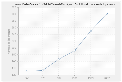 Le nombre de logements de Saint-Côme-et-Maruéjols était de 301 en 2007, 250 en 1999, 192 en 1990, 166 en 1982, 133 en 1975 et 131 en 1968.