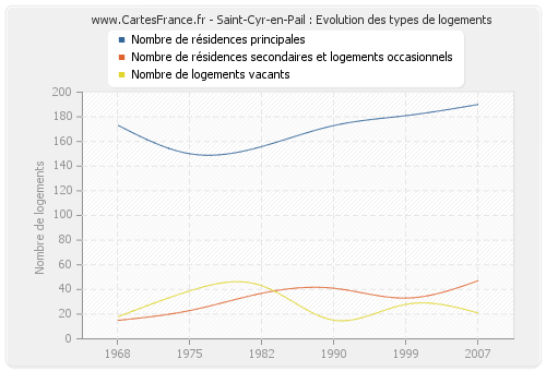 Les graphiques suivant reprennent l'historique du nombre et du type de logements de Saint-Cyr-en-Pail de 1968 à 2007. Le deuxième graphique est tracé en interpolation cubique. Ceci permet d'obtenir plus précisément le nombre de logement du village de Saint-Cyr-en-Pail les années ou aucun recensement n'a été effectué.