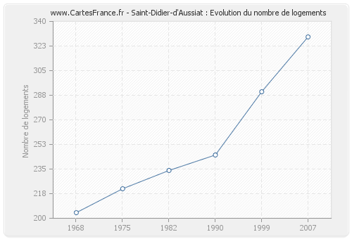 Le nombre de logements de Saint-Didier-d'Aussiat était de 329 en 2007, 290 en 1999, 245 en 1990, 234 en 1982, 221 en 1975 et 204 en 1968.