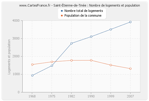 La population de Saint-Étienne-de-Tinée était de 1 320 habitants en 2007, 1 519 habitants en 1999, 1 783 habitants en 1990, 1 780 habitants en 1982, 1 700 habitants en 1975 et 1 549 habitants en 1968. Parallèlement, le nombre de logements de Saint-Étienne-de-Tinée était de 3 925 en 2007, 3 513 en 1999, 3 105 en 1990, 2 734 en 1982, 1 485 en 1975 et 937 en 1968.