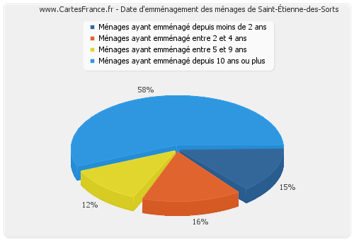 - Nombre de ménages de Saint-Étienne-des-Sorts ayant emménagé depuis moins de 2 ans : 33