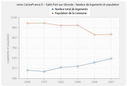 La population de Saint-Fort-sur-Gironde était de 908 habitants en 2007, 903 habitants en 1999, 1 012 habitants en 1990, 1 009 habitants en 1982, 1 036 habitants en 1975 et 1 035 habitants en 1968. Parallèlement, le nombre de logements de Saint-Fort-sur-Gironde était de 629 en 2007, 584 en 1999, 540 en 1990, 528 en 1982, 481 en 1975 et 495 en 1968.